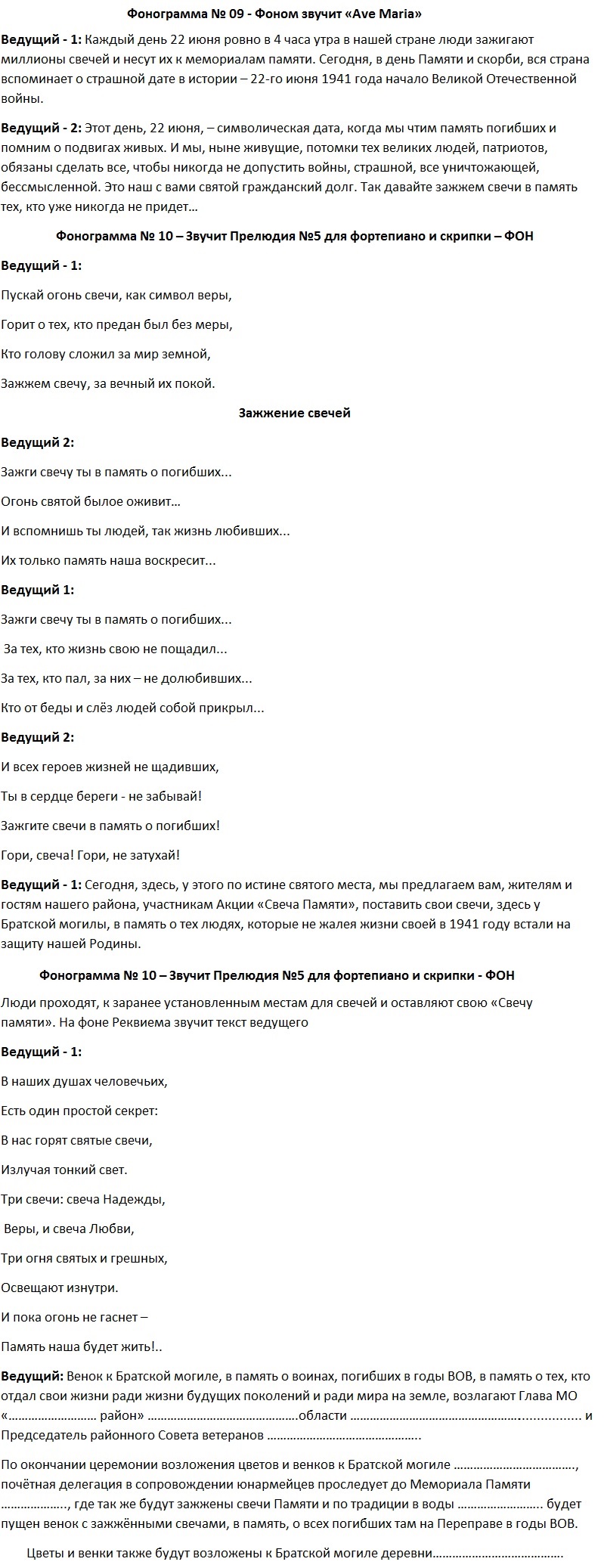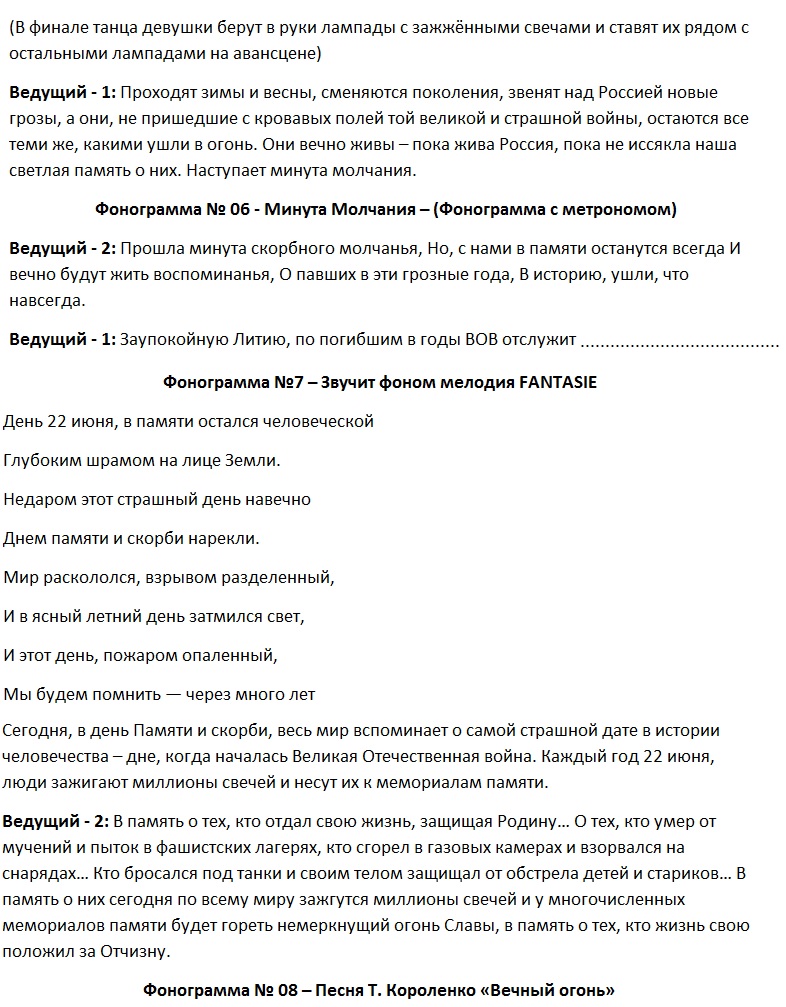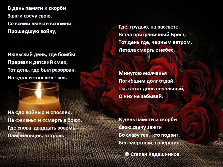 PS: Возложение венков, зажжение свечей-традиция, которая напоминает всему человечеству о героизме, смелости, отваге. О том, какой ценой достался нам мир. Сколько солдат, мирного населения, детей, погибло в те страшные, военные годы. Зажжение свечей-это святая обязанность каждого из нас. Свеча на окне имеет большее значение, чем сотни слов. Она красноречивее, чем акции, мероприятия, официальные речи местных властей. Свеча на окне говорит: «мы помним, мы не забыли!».