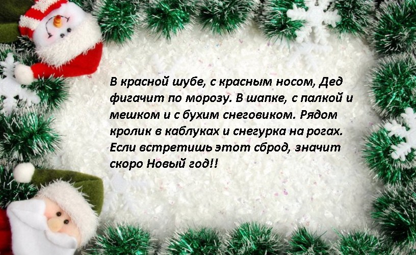 • Канун Нового года… На столбе висит объявление: «Вы можете по телефону заказать Деда Мороза и Снегурочку». Пьяный, держась за этот столб, горько плачет — Изверги, киллеры, Деда Мороза заказали.