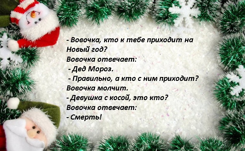 • Дед Мороз пришел к одному мальчику поздравить с Новым годом и спрашивает его, чтобы он хотел на Новый год? Мальчик в ответ ударил Деда Мороза, ничего не говоря. Дед Мороз спрашивает: «За что?» Мальчик отвечает: «А это за прошлый год!»