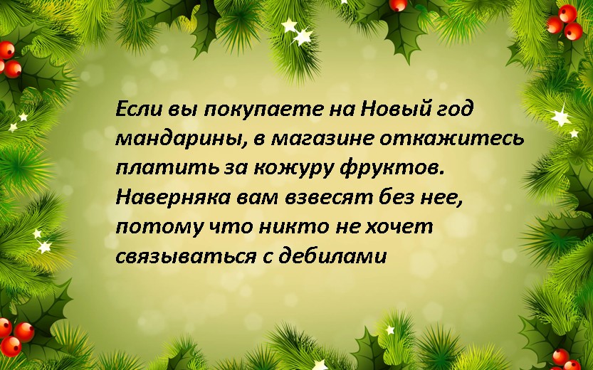 • Разговаривают два приятеля, один другого спрашивает, как тот встретил Новый год? Приятель отвечает: «Как подарок, всю ночь под елкой пролежал.»