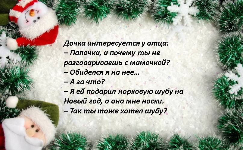 • Разговаривают два подвыпивших мужика, один спрашивает: «Ты зачем дернул Деда Мороза за бороду?» Другой мужик: «Проверить хотел, настоящая борода или нет.» Другой мужик: «Ну и как?» Ему отвечают: «Настоящая оказалась, не знаю теперь, что с ней делать!»