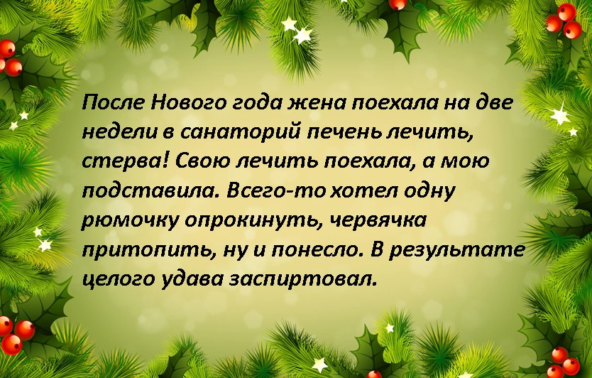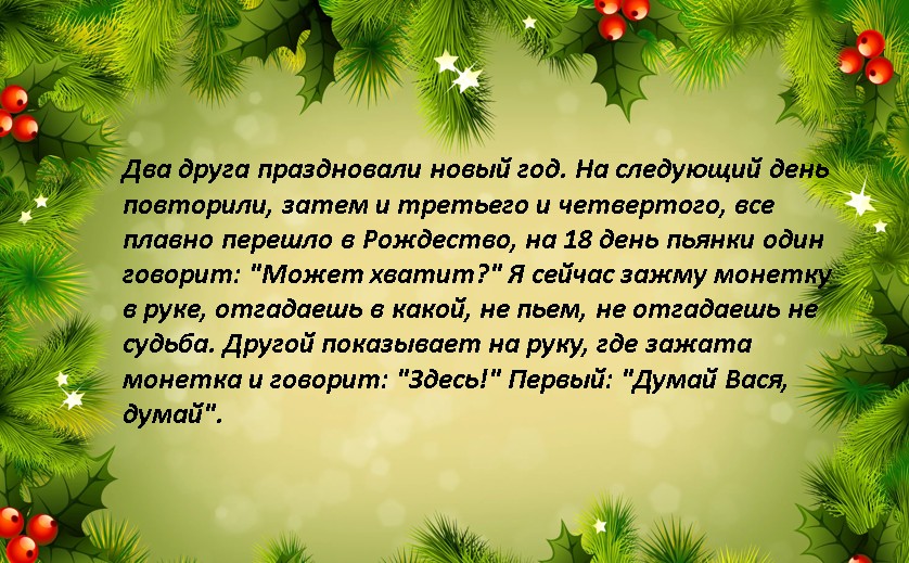 • Дорогая, все-таки как хорошо на Новый год не пить! От всей души нагулялись, проведали всех друзей, фильмов насмотрелись, Рождество тоже отметим по человечески. Жена отвечает: «Дорогой, 9 число уже!»