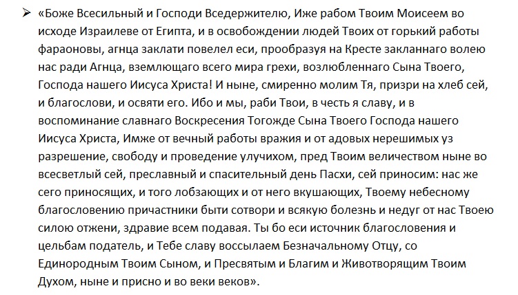 Освящение хлеба происходит на праздничной пасхальной литургии. Все хлеба, которые будут освящать располагают перед Царскими вратами. Затем священник читает молитву: