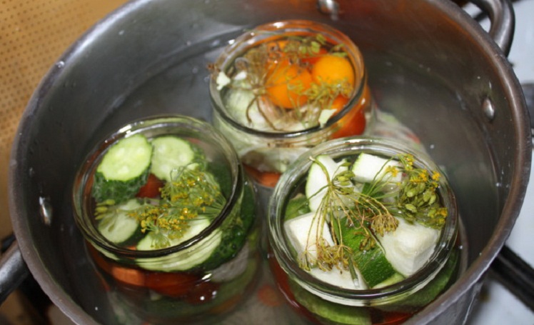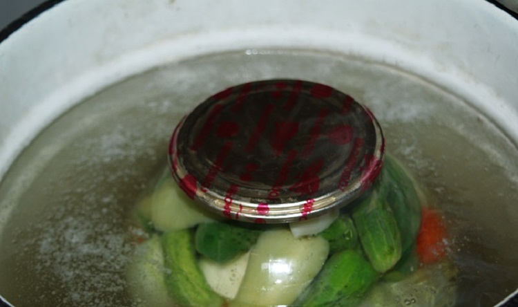 В большом ведерке доводим воду до кипения. Помещаем аккуратненько нашу посуду для стерилизации. На горлышко баночки нужно положить обработанную крышечку. В бурлящем кипятке овощи стерилизуются примерно 15 минут. Если посуда будет объемом 2 л – нужно 10 минут, 1л – 5-7 минут.