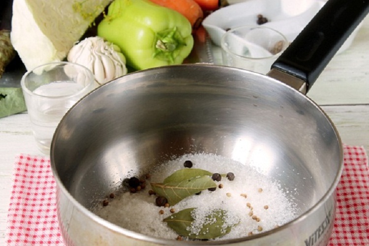 В емкости соединяем воду, все компоненты для маринада. Его необходимо вскипятить. Аккуратно заполняем посуду. Если сразу влить всю жидкость, посуда может лопнуть.