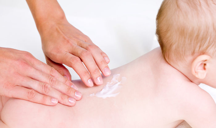 - На влажный кожный покров наносят эмолент в необходимом количестве. Если есть очаговые воспаленные зудящие места, то вначале обрабатывают кожу мазью с кортикостероидами, прописанную педиатром, а затем наносят средство, сохраняющее влажность кожи.