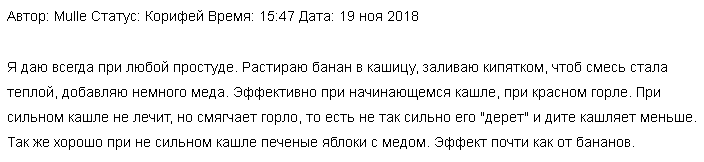 Прежде чем давать ребенку средство с бананом от кашля, необходимо выяснить, нет ли у малыша аллергии на этот фрукт. Так же, каждому молодому родителю следует знать, что бананы показаны детям к употреблению, начиная с 9 месяцев. Когда ребенку исполнится 1,5 года, ему можно давать практически, все продукты. Но, при приготовлении средства от кашля, необходимо, пока ограничиться простым рецептом, не используя в нем мед, цитрусы и какао, так как это аллергеноопасные ингредиенты. В 2,3 года разрешается употреблять детям отвары, молоко, чай с бананом. В 4 года уже можно добавлять какао и мед.