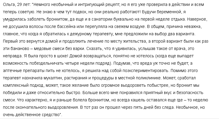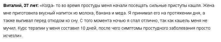 - Приготовьте 1 спелый банан, небольшую луковицу и 1 чайную ложку меда. Смешайте все компоненты, нагрейте на водяной бане, процедите через сито. Употребляйте несколько раз в сутки. Через три дня вы увидите ощутимый эффект.