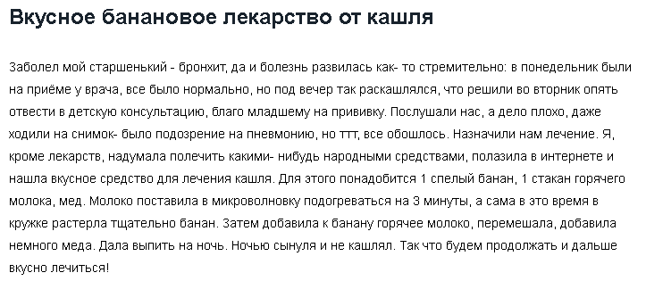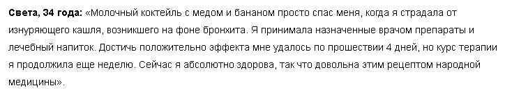Молоко имеет в своем составе много полезных веществ, за счет чего его пищевая ценность достаточно высока. В сочетании с бананом получается средство для лечения кашля. Употребление этих двух продуктов абсолютно безопасно, поэтому многие отдают им предпочтение, прежде чем сделать выбор в пользу лекарственных препаратов. При влажном кашле улучшается отделение слизи.