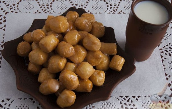 Баурсак татарский — это всегда праздничное блюдо, посыпанное пудрой сахарной или политое любым сиропом . Он напоминает чак-чак, только большего размера. Представленный ниже рецепт из яичного теста.