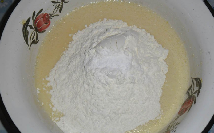К полученной смеси добавляем муку, (предварительно просеиваем). После этого, в получившийся холмик насыпать соль.