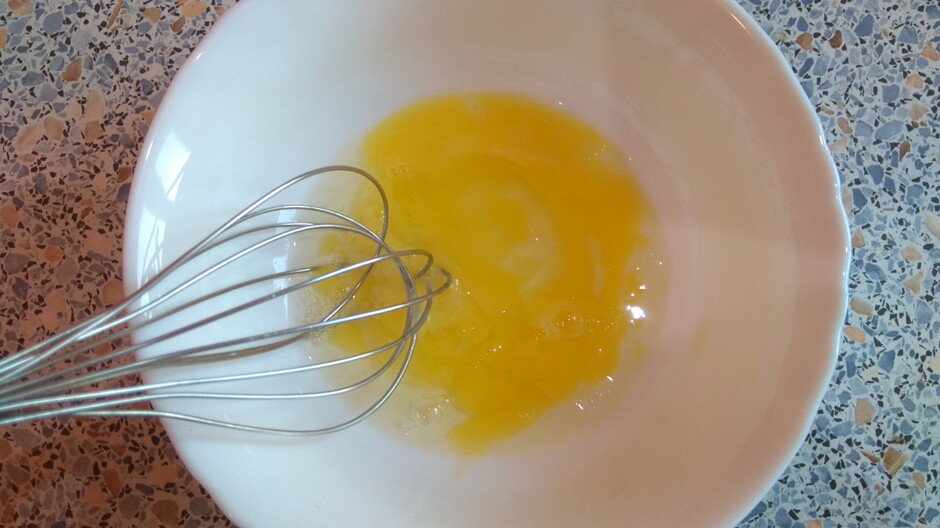 Разбиваем яйца в миску, добавляем муку, соль и масло. Перемешиваем венчиком.