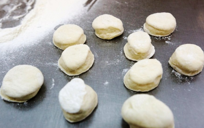 Вырезать стаканом или другим приспособлением круглые лепешки. Накрыть хлопчатобумажной тканью и убрать в тепло для подъема. Раскалить в кастрюле масло, убавить огонь и поместить подготовленные лепешки. Обжаривать с двух сторон до подрумянивания. Выложить на салфетку и дать стечь маслу.