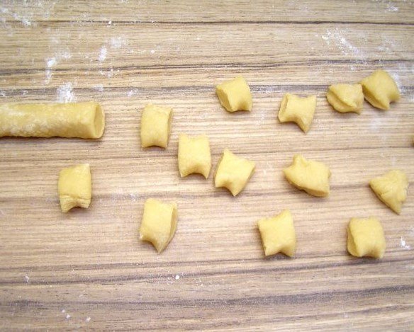 Затем порежьте на несколько «колбасок» одинакового размера. Нарежьте каждую колбаску на кусочки  и сформируйте шарики.