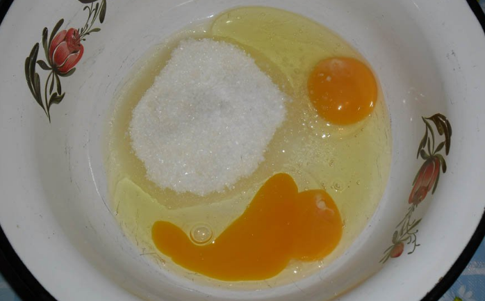 Возьмите глубокую миску и вбейте яйца. Затем добавьте соль, сахар и взбейте.
