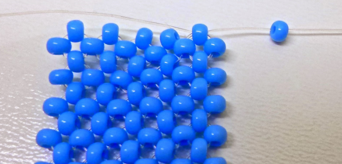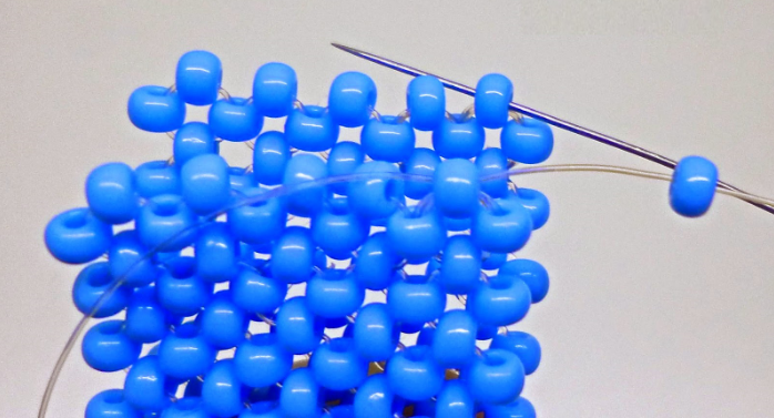 Тот же конец лески необходимо пропустить через верхнюю бисеринку соседнего креста из нижнего ряда по направлению продолжения плетения.