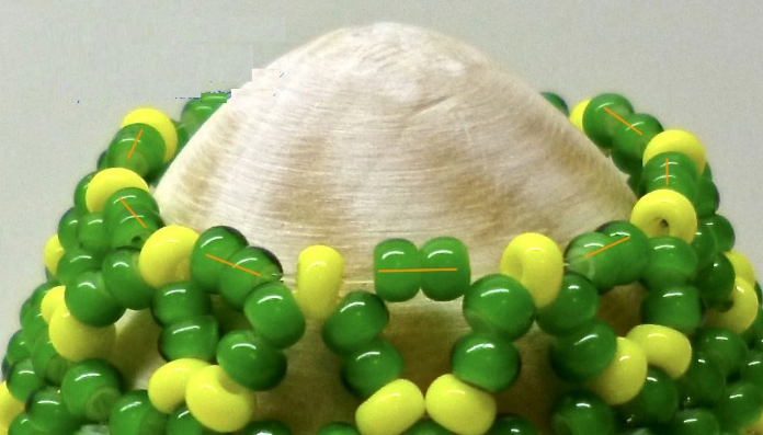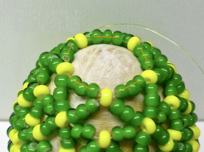 Теперь необходимо оплести макушку. Разведите леску по верхней и нижней стороне яйца и оплетите поочередно верх и низ. Для симметричности рисунка верх начините делать, продев леску через зеленую бисерину над желтым крестиком.