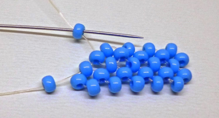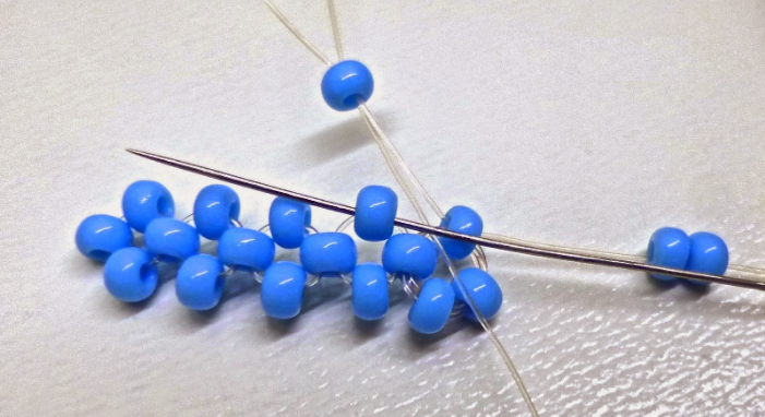 Пропустите одну иголку через крайнюю бисерину с противоположного конца лески.