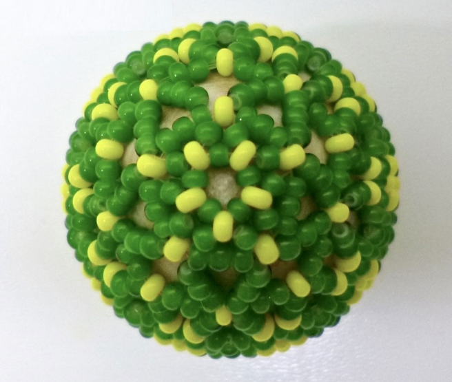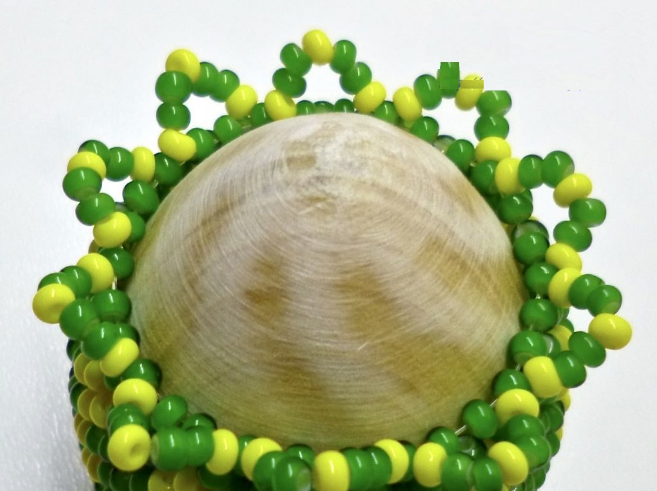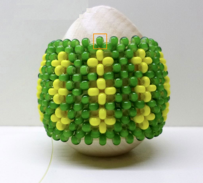- Чтобы оплести верхушки, необходимо добавить ряды. Нанизайте бисеринку, проденьте иголку через бисерину из ряда, приплетая рядом новую. Когда закончите ряд, проденьте через все нанизанные бусины иглу и стяните, так сформируется ровный ряд. По мере сужения яйца уменьшайте количество нанизываемых бисеринок.