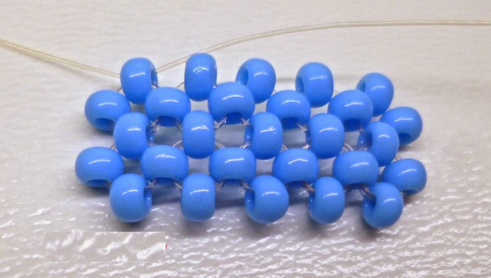 Для плетения полотна необходимо сделать второй ряд крестиков. Пропустите каждую из иголок вкруговую через бисерины последнего крестика.