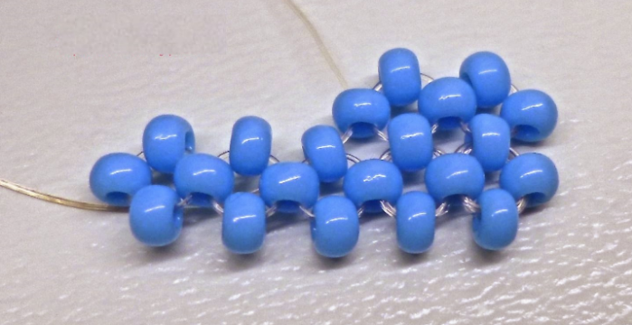 - Протяните следующие две бисерины, проденьте иглу через третью, потом вторую, потом пятую. Стяните.