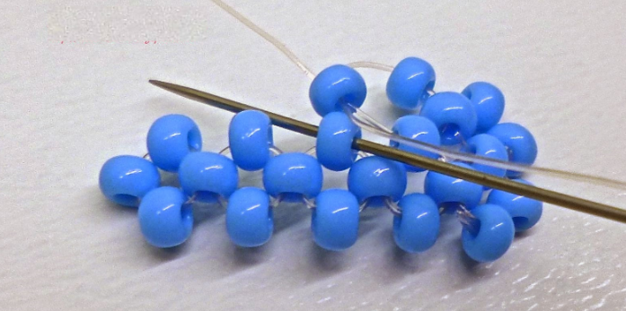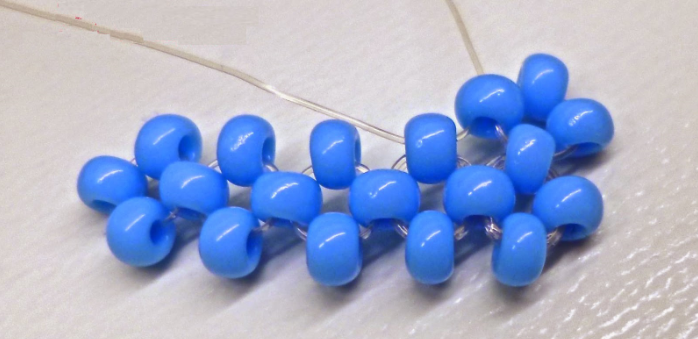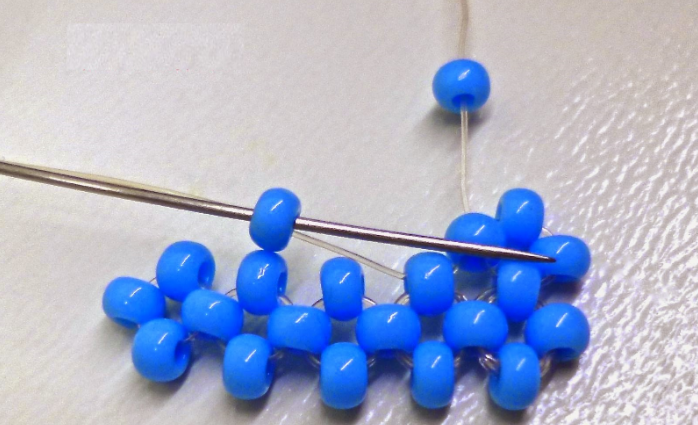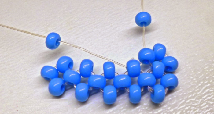 Пропустите иглу, ближе к которой одна бисерина, через крайнюю бисерину с противоположного конца лески.