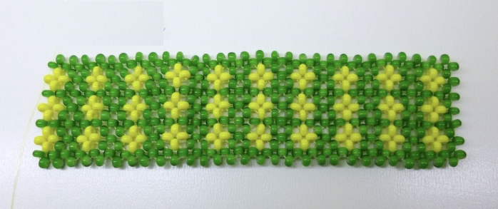- Продолжайте по такой же схеме, пока не получится пояс из бисера. Соедините кончики пояска при помощи иголки.