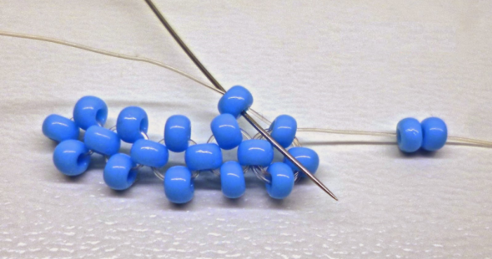 - Метр нити проденьте в иголку. Выполните двухрядный пояс из бисерин. К ним потом будете приплетать остальные. Четыре бисерины вденьте в иглу, протяните. Пропустите иглу через первые две, притяните. Бисерины сложите попарно.