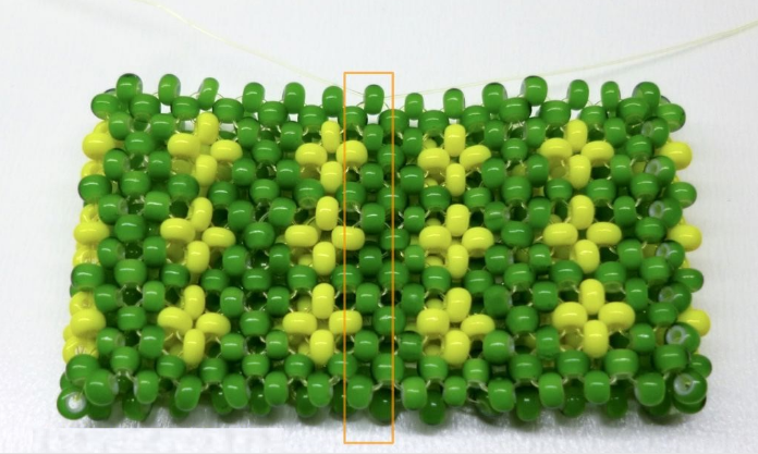 При помощи восьми дополнительных бисерин соедините между собой полотно. На конец лески, смотрящий в сторону от плетения, наберите одну бисеринку. Оба края пояска сложите и пропустите данный конец лески через ближайшую бисерину, которая находится на противоположном крае изделия.
