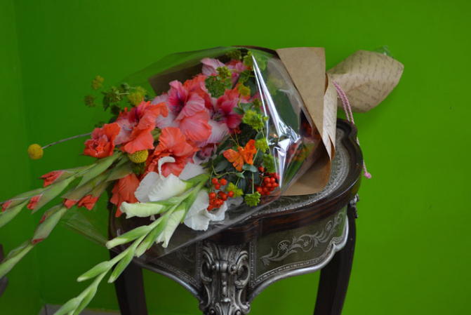 Актуальная техника составления букетов из гладиолусов — wild (дикий). В этом стиле используются экзотические растения тропиков, что позволяет воплотить фантазии на тему природы, не освоенной человеком. Такой букет можно подарить не только женщине, но и мужчине.