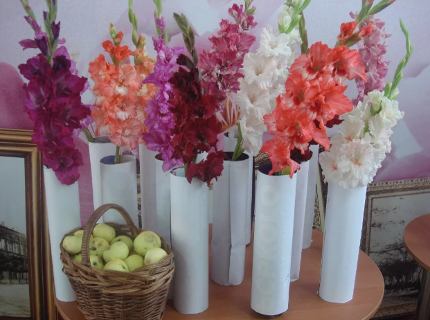 Если правильно ухаживать за букетом из гладиолусов, он простоит 15 дней. Воду нужно менять каждые два дня, подрезая стебель на один сантиметр.