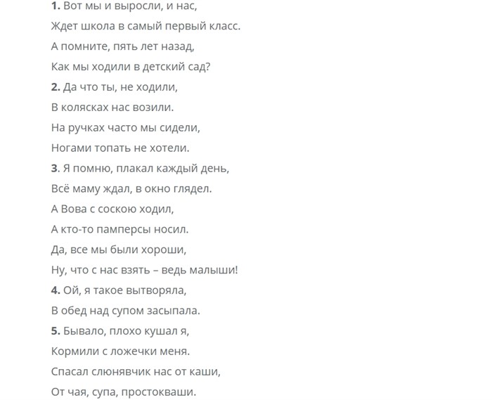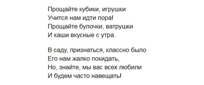 Ни один утренник в детском саду, а уж тем более выпускной, не обходится без мини-концерта, который обязательно включает в себя исполнение песен. Исполняют песни все выпускники и не обязательно, чтобы все дети умели петь, ведь искренность малышей и душевность исполнения скрасят все непопадания в ноты. Однако важно успеть подготовиться и выучить тексты песен. Тексты оных должны быть не вычурными и простыми, дети должны понимать, о чем они поют и только тогда смогут с легкостью запомнить композиции. Мы подготовили небольшую подборку простых песен, в том числе и песен переделок, которыми и предлагаем вам воспользоваться при подготовке к данному празднику.