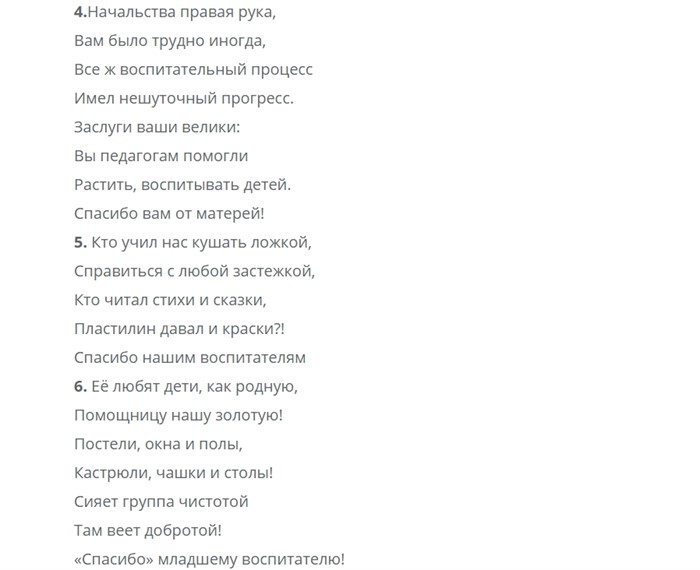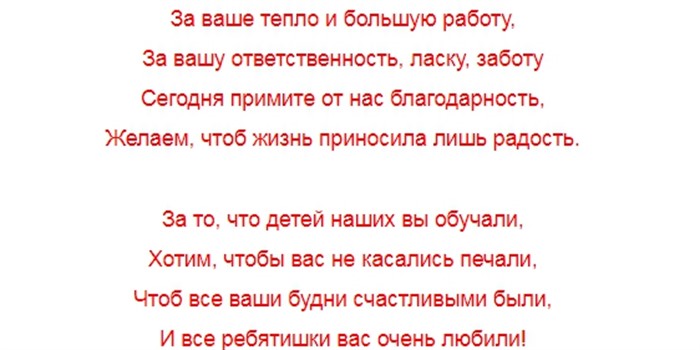 Дорогая и уважаемая нами (имя отчество воспитателя). Хочется поблагодарить вас за ту искренность и доброту, которыми были окутаны наши детки все эти годы! Спасибо огромное за веру в каждого нашего малыша, за их развитие, за индивидуальный подход, за любовь и сопереживания, за все те прекрасные дни, которые вы проводили с нашими чадами! Хочется, чтобы ваши новые воспитанники вам всегда отвечали добротой, уважением и искренностью. Желаем только ясных дней, здоровья и мирного неба!