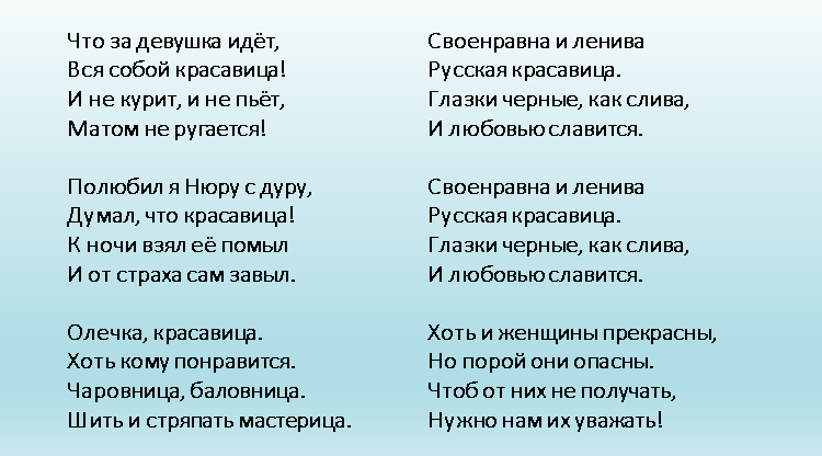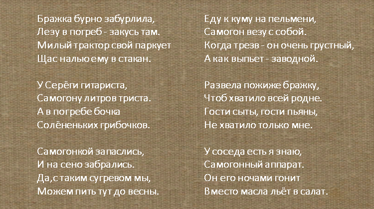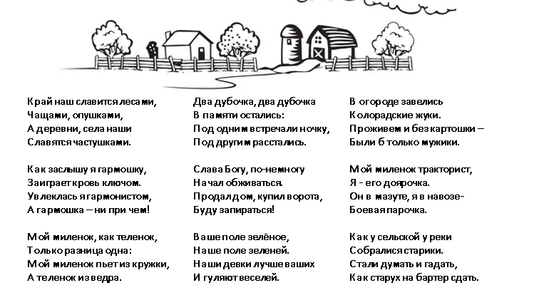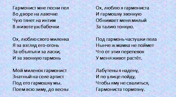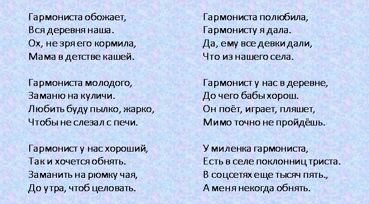 Наш народ очень любит частушки, когда слышишь их ритмичное пение под гармонь, ноги сами идут в пляс. Зародились они в русских деревнях и объединяли в себе музыкальное сопровождение, пение и танцы. Главная их отличительная черта — импровизация. Когда звучал знакомый наигрыш, каждый мог зачастить (именно от этого слова образовалось название этого фольклорного жанра) короткие четверостишья, буквально, что в голову придет. Посвящали частушки любовным отношениям, трудовым будням и событиям на злободневную тему. Мелодия всегда одна, буквально несколько аккордов, которые подойдут под любую частушку. Чтобы весело провести время, подурачиться и поплясать, предлагаем для вас подборку разной тематики.