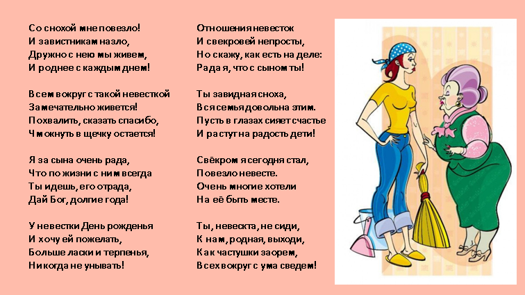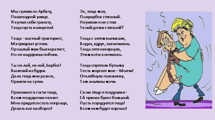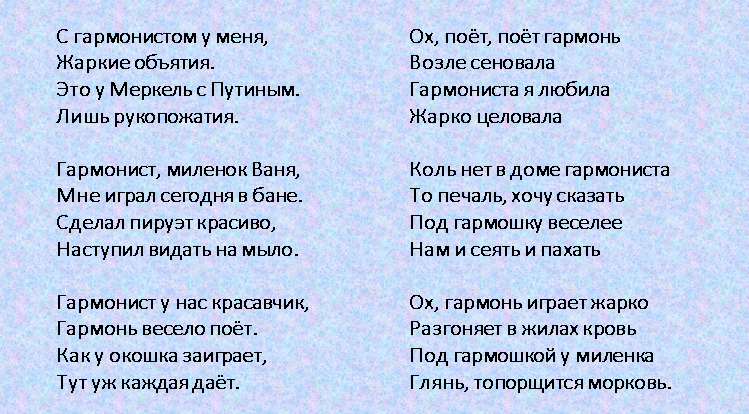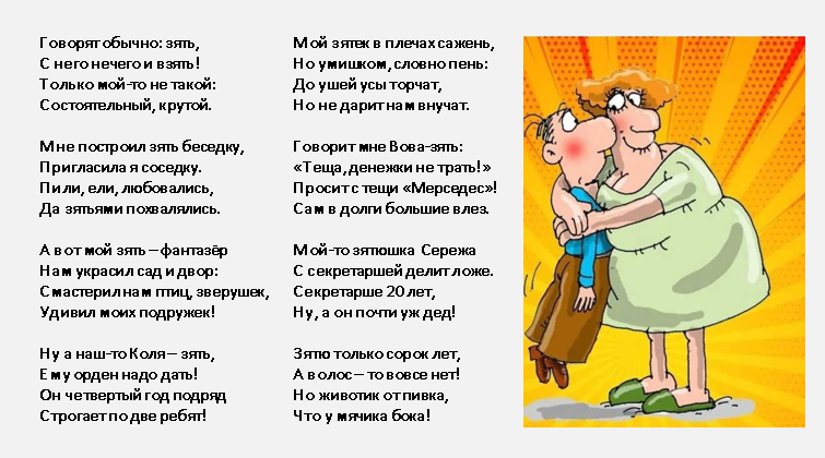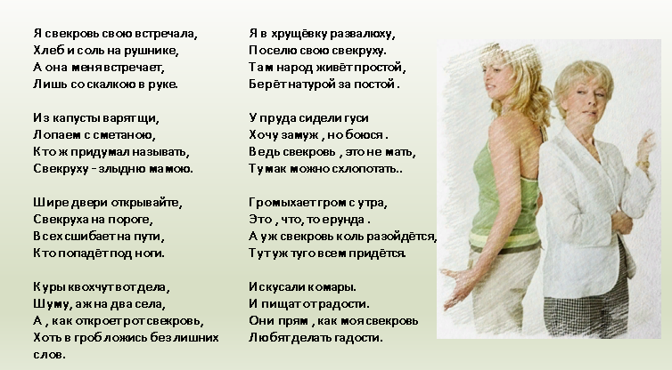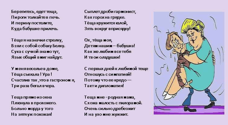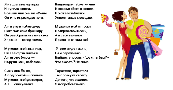 Частушки прикольные шуточные, короткие смешные частушки, прикольные смешные частушки про: пенсию, пенсионеров, день рождения, про женщин и мужчин, про рыбалку и рыбака, про свадьбу, гармониста, про самогон, баню, про зятя, невестку, свекровь, тещу, про внуков, про медиков, про деревню и село, жизнь и любовь
