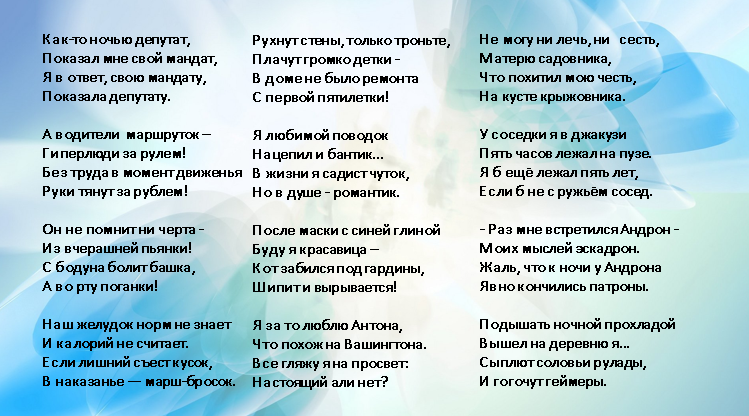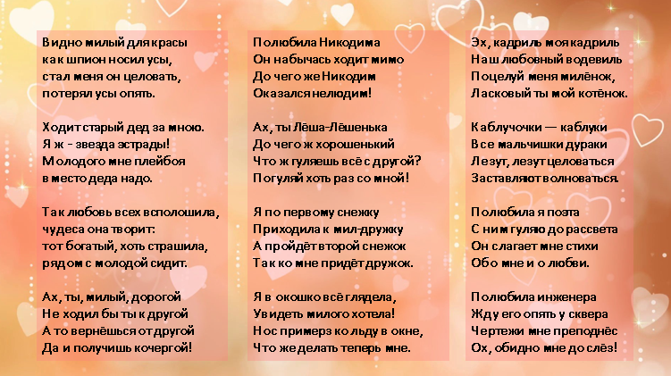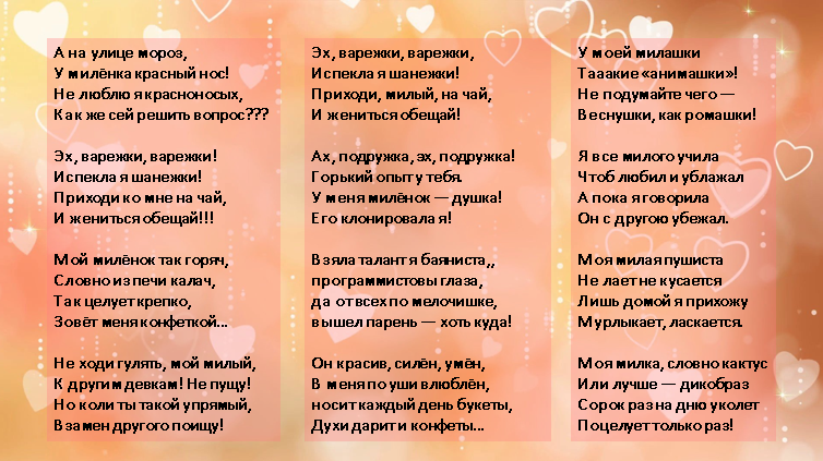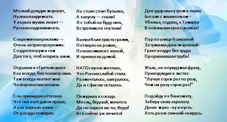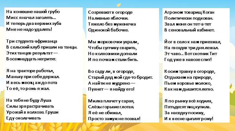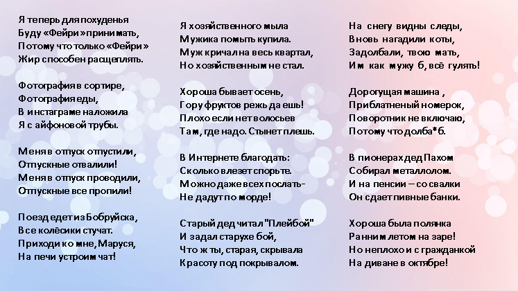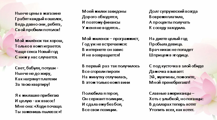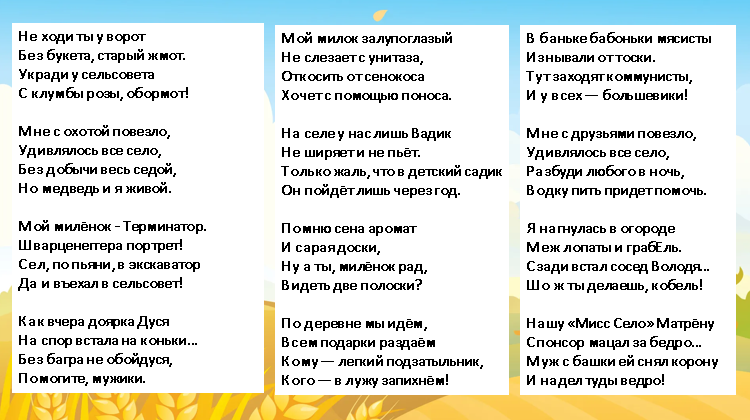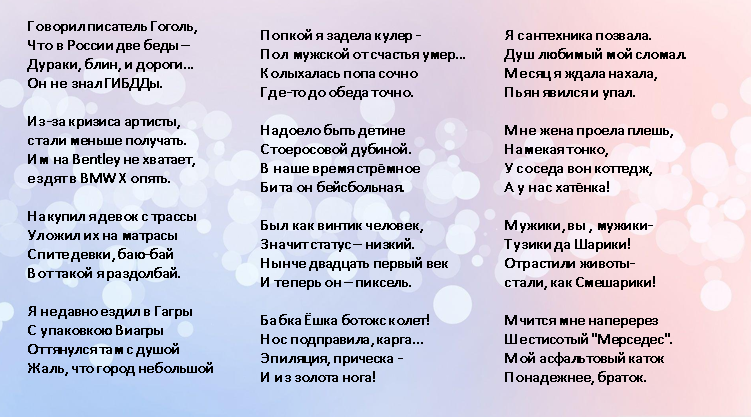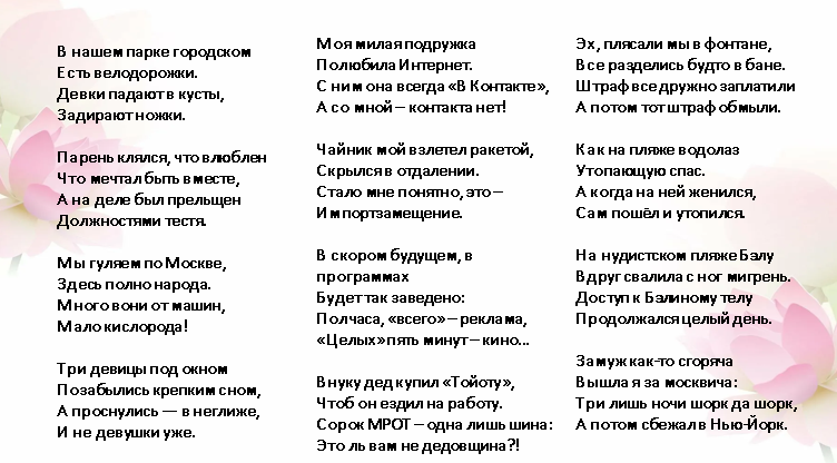 Темой частушек становится любое явление, происходящее в нашей жизни. Они могут высмеивать негативные поступки людей, посвящаться человеку какой-либо профессии, увлечению, хобби, отношениям между мужчиной и женщиной. Но, главная их фишка — это юмор, который заставляет смеяться буквально до слез. Частушки давно перестали быть частью деревенского быта, их поют во всех населенных пунктах на свадьбах, вечеринках, застольях, праздниках, юбилеях. Не стоит забывать об этом интересном и уникальном народном жанре, рекомендуем обязательно воспользоваться возможностью сохранить их из нашей подборки.