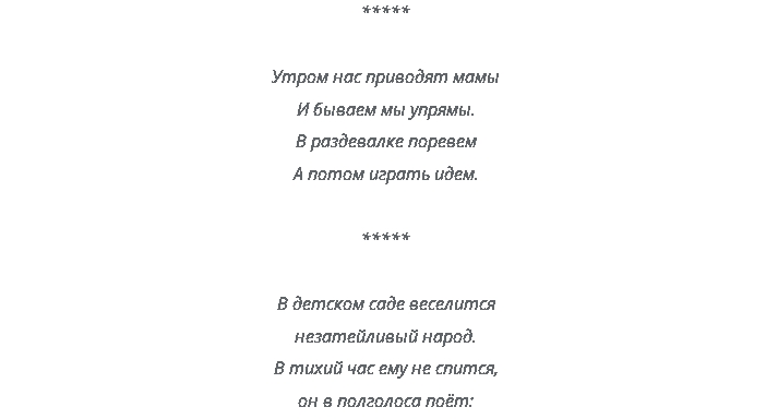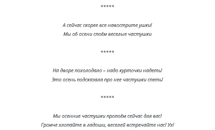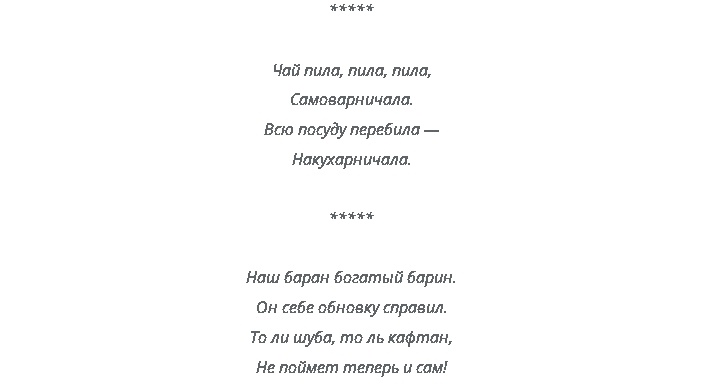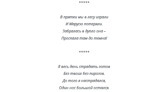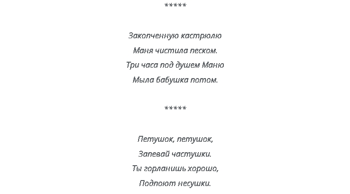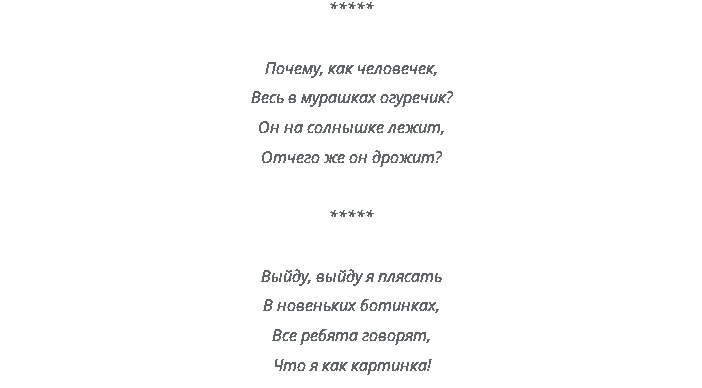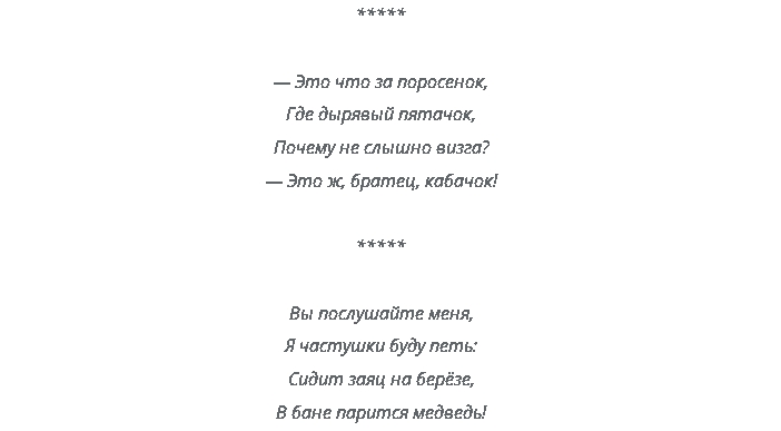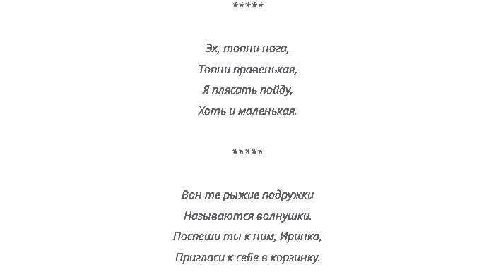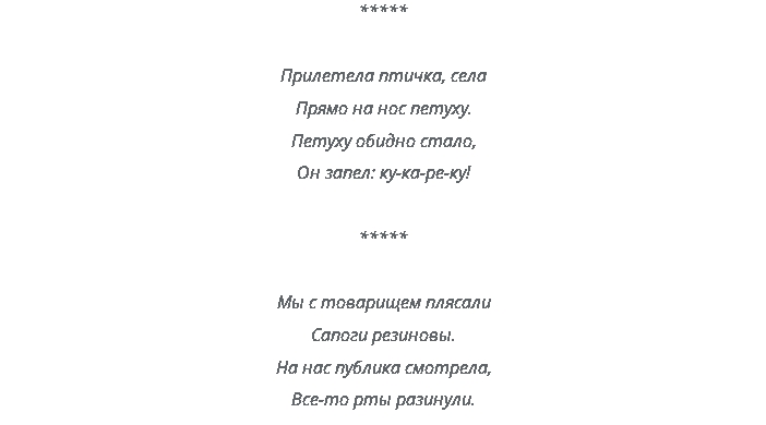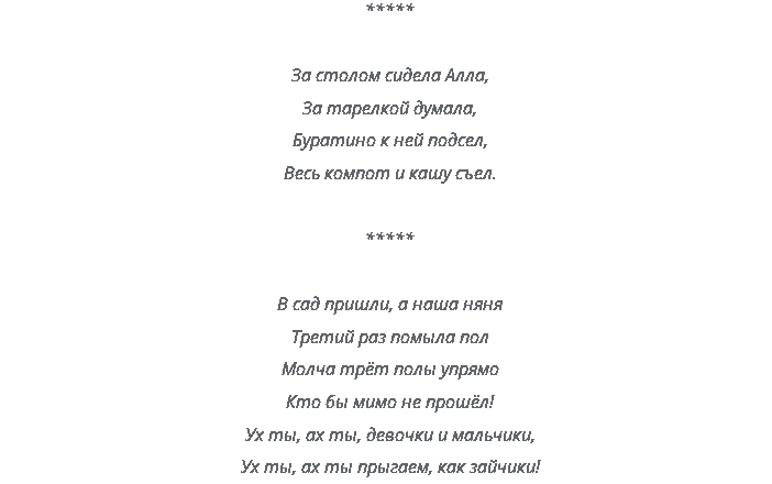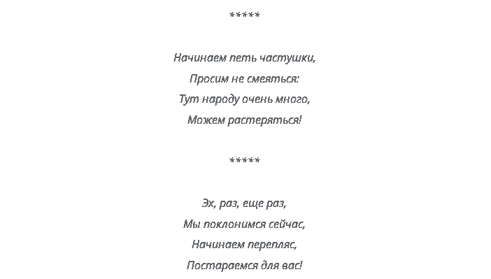 В этом разделе мы собрали частушки самой разной тематики. Разучите их заранее с детьми, чтобы организовать представление в любое время.