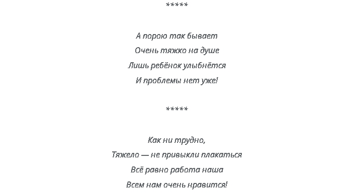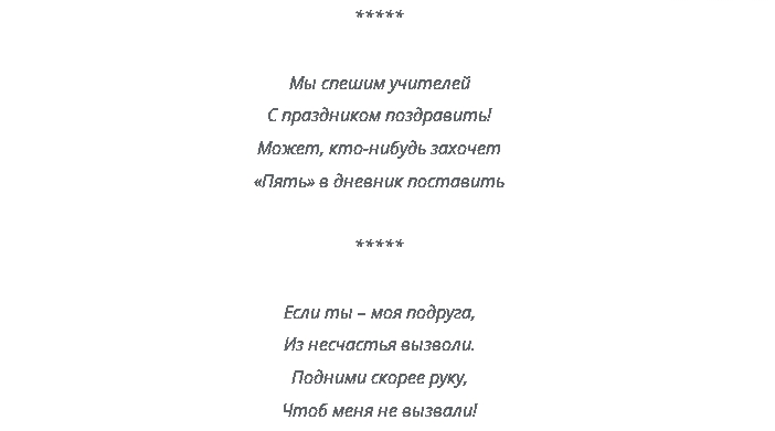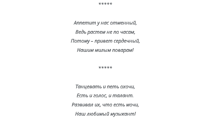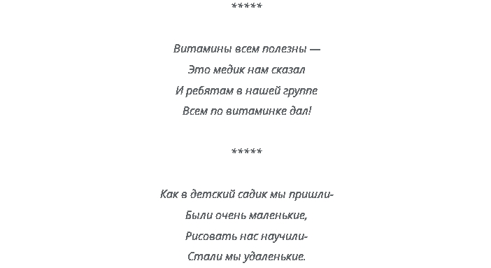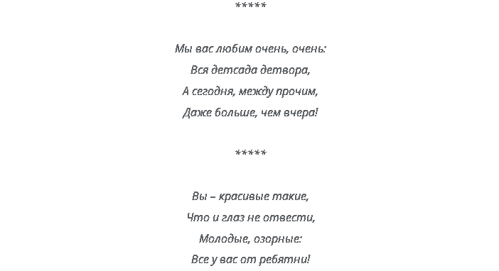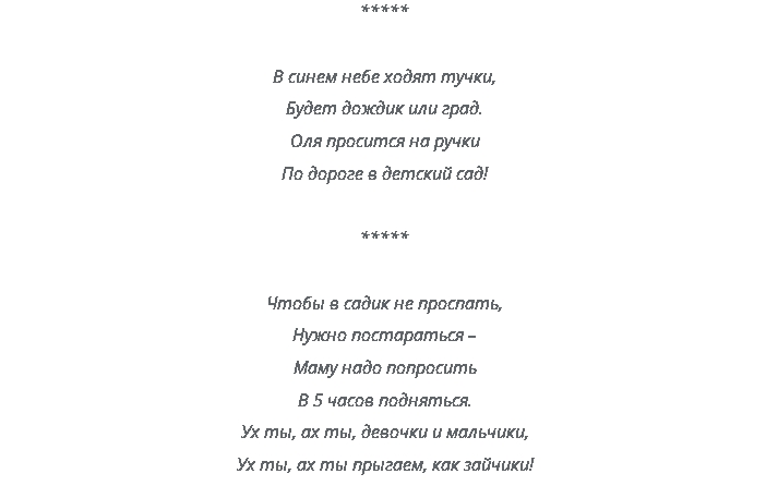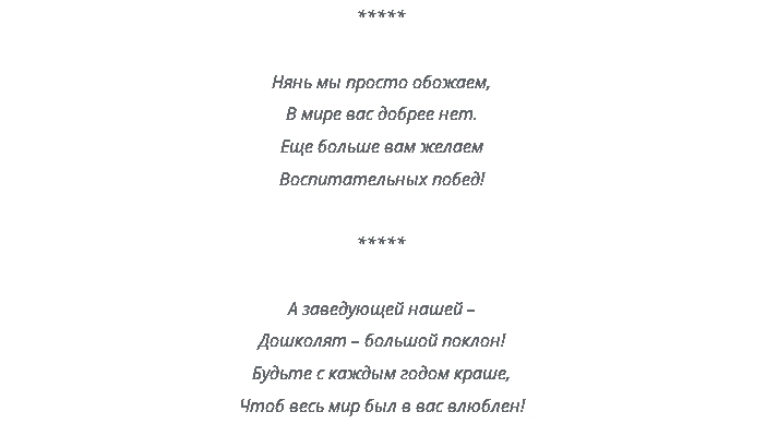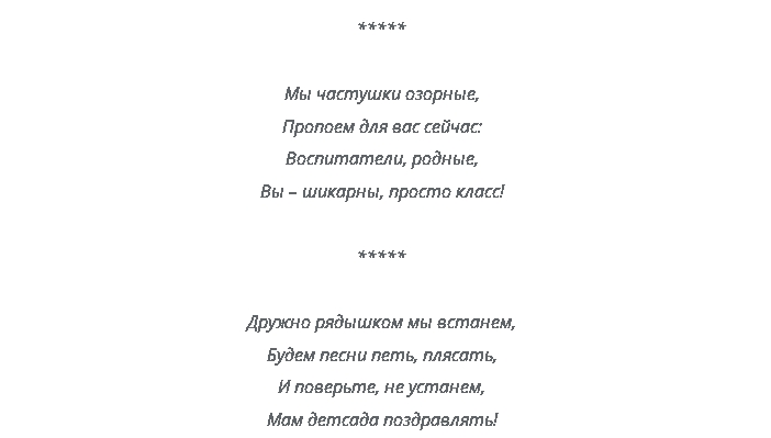 Первое учреждение в жизни ребенка, где его оставляют родители на целый день, это детский сад. Воспитатели стремятся создать для детей приятную атмосферу и дать первые знания об окружающем мире. Чтобы выразить благодарность и уважение, дети могут спеть для них веселые частушки.
