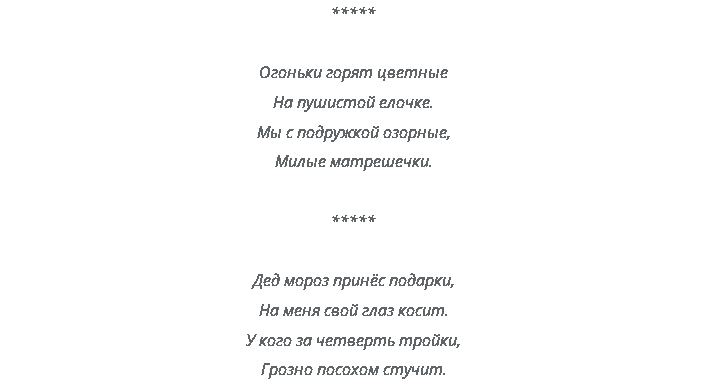 Новый год, самое подходящие время для выступлений. Помимо привычных праздничных номеров, исполнение частушек станет настоящий изюминкой мероприятия.