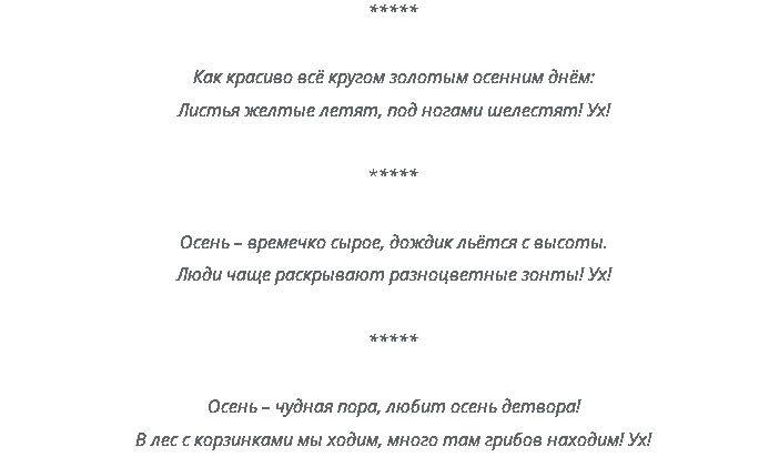 После теплого лета наступает осенняя пора с дождями и плохой погодой. Но, повода для грусти быть не должно, ведь можно развлечь детей с помощью разучивания и исполнения частушек про осень. Так они быстрее поймут, что каждое время года хорошо по своему.