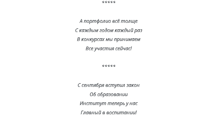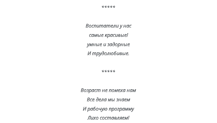 Рекомендуем включить в праздничную детсадовскую программу исполнение частушек самими воспитателями. Это может быть организация концерта в честь выпускной группы, на День воспитателя или 8 марта.