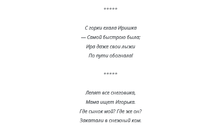 Все дети любят зиму, ведь только в это время года можно так весело проводить время, кататься с горки и лепить снежки. Разучите с детьми частушки про курьезные ситуации, которые могут происходить с ребятами во время игр на свежем воздухе.