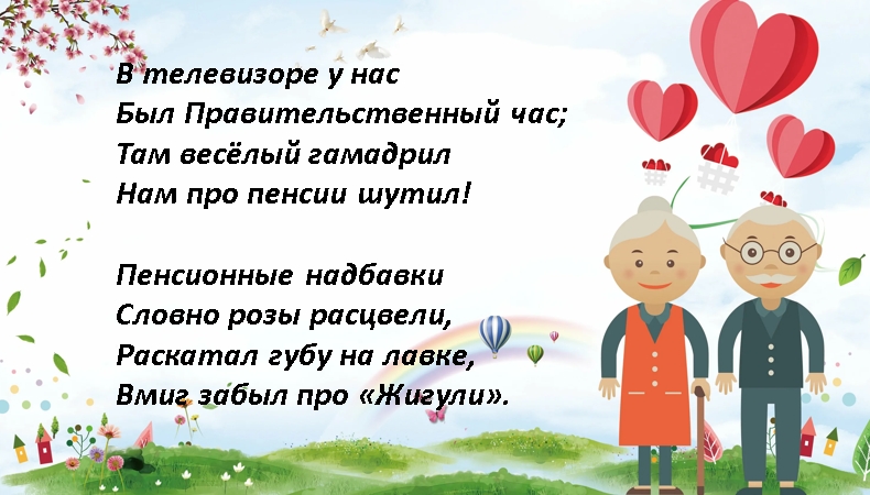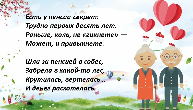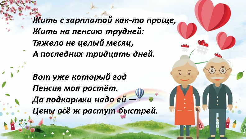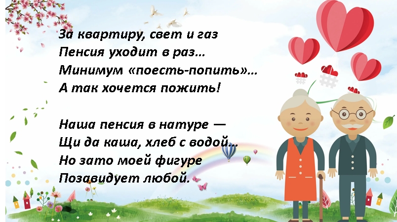 Пенсия, неизменный предмет обсуждения любого человека, вышедшего на заслуженный отдых, ведь ее всегда не хватает. Немного повеселиться и поднять настроение помогут частушки, которые рассказывают о жизни пенсионеров с юмором.