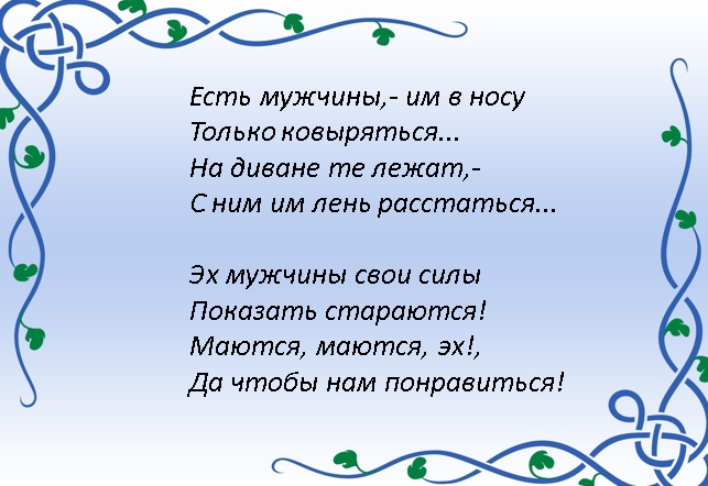 Женщины, в свою очередь, могут пропеть веселые и задорные частушки про мужчин, в которых подмечены чисто мужские черты.