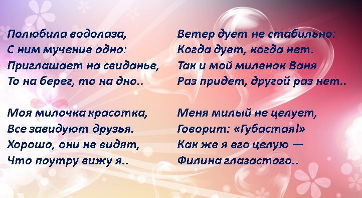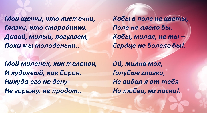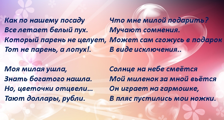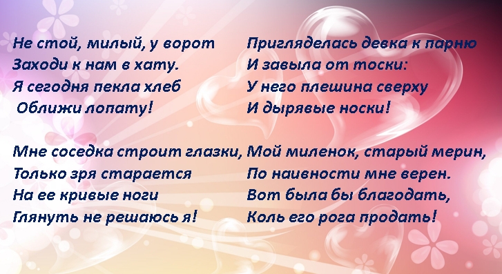 Любовные частушки будут актуальны всегда. Раньше их пели в основном в сельской местности, сегодня народные традиции возрождаются и их можно услышать на свадьбах и других увеселительных мероприятиях.