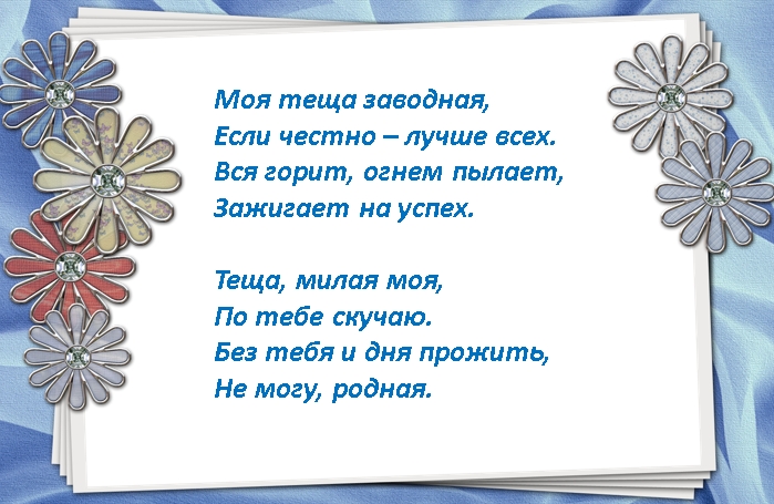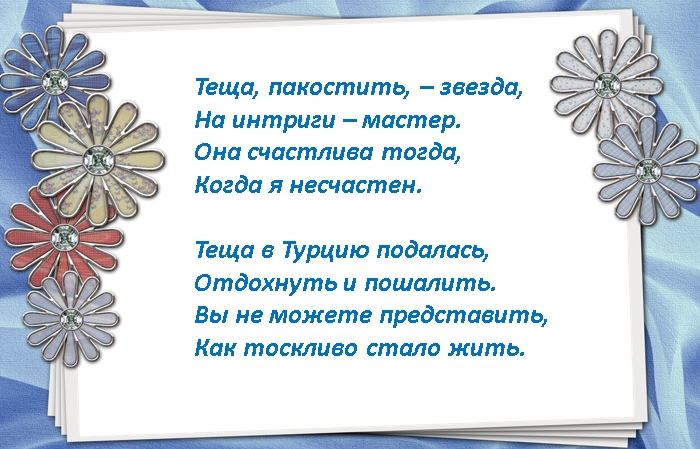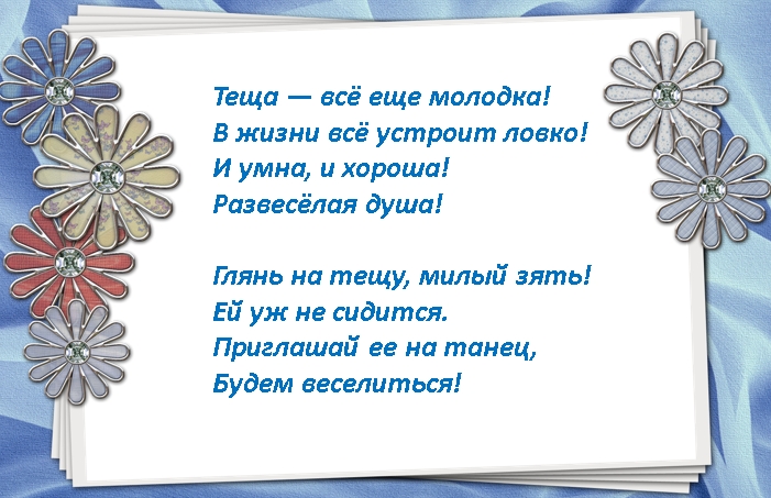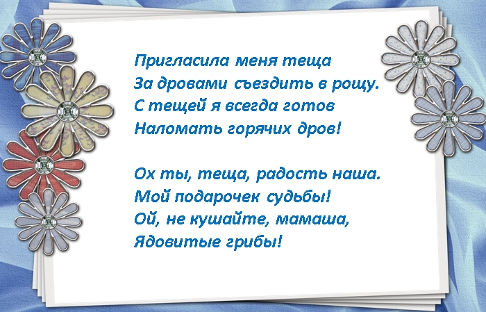 Теща является почти анекдотическим персонажем. К любому семейному торжеству с ее присутствием подойдут частушки, написанные с юмором.