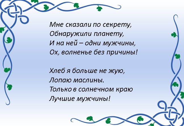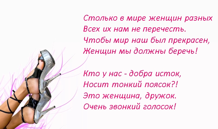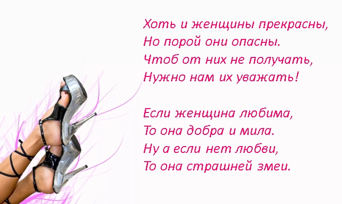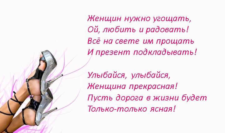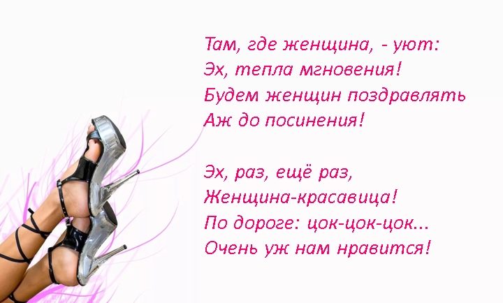 Женщинам больше принято читать стихи и петь песни, но и частушки вполне подойдут, чтобы выразить восхищение прекрасной половиной человечества.