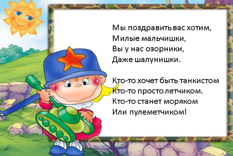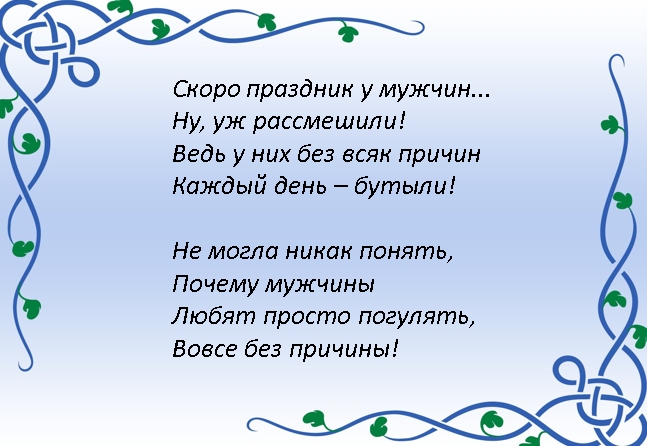 Поздравить мальчишек в своем классе возможно не только купленным подарком, но и веселым концертом, на котором обязательно найдется месту номеру с частушками.