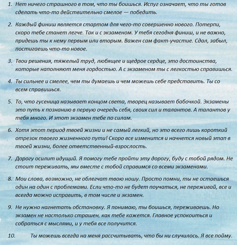 Слова поддержки перед экзаменом помогают поднять самооценку, поверить в свои силы, дают понять что ты не одинок, тебя любят и поймут в любом случае.