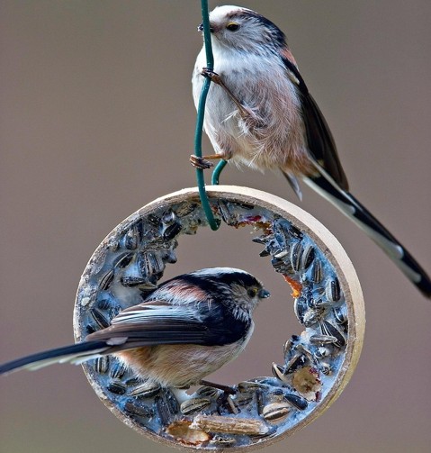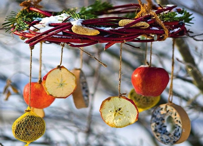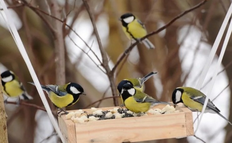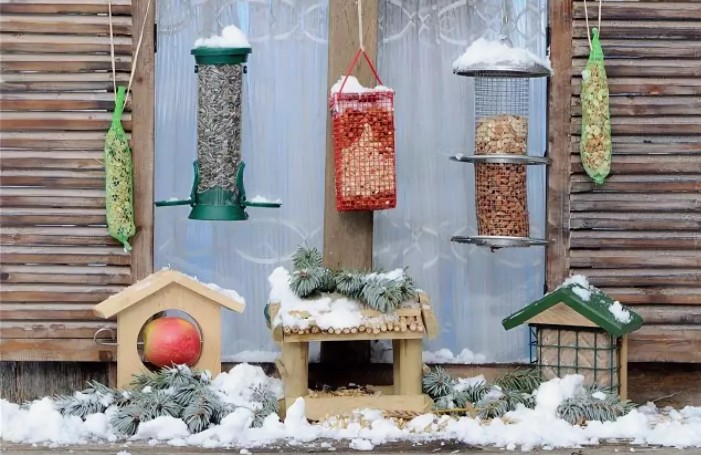 Зимой можно увидеть большое разнообразие птиц в развешанных людьми кормушках, каждая птичка предпочитает свой вид корма.